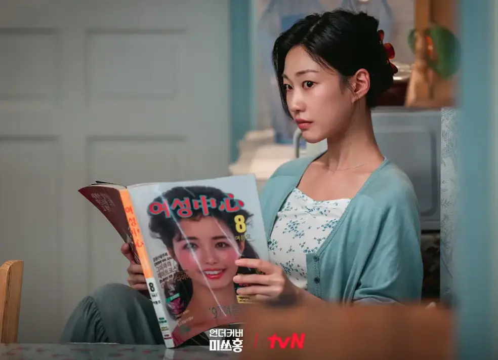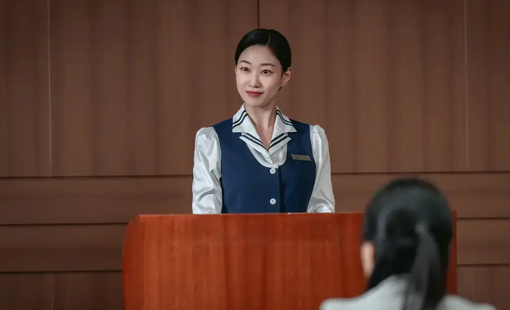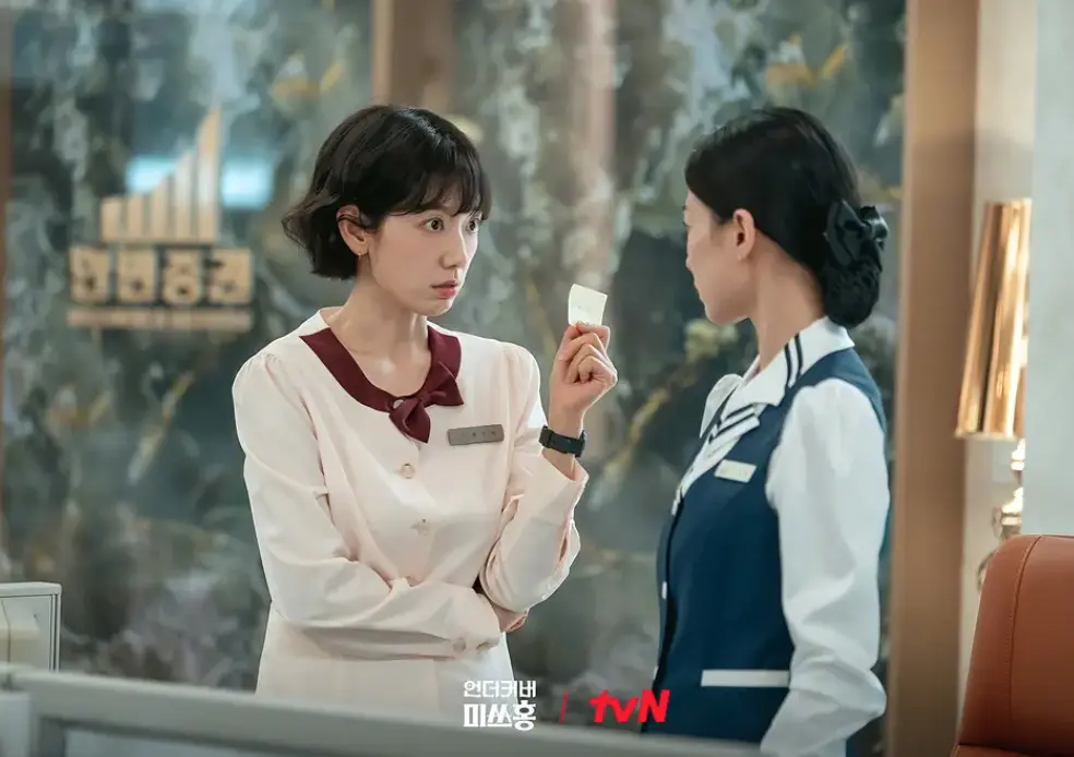 为了潜入,她不得不伪装成20岁的高中毕业生“洪张美”,穿着复古衬衫百褶裙,说话故意放软语气,抱着文件慌慌张张跑腿,和平时穿西装、眼神锐利的精英状态判若两人。
