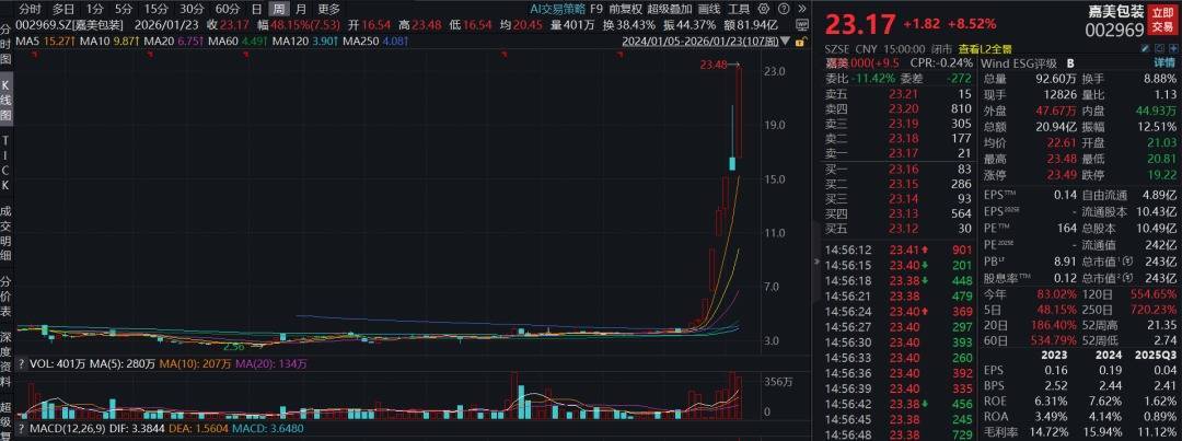 1月23日收盘,嘉美包装股价收涨8.52%,收于23.17元/股,总市值243亿元。