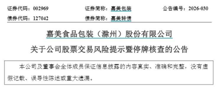 嘉美包装(002969)公告称,自2025年12月17日至2026年1月23日期间,公司股票价格涨幅为408.11%,期间多次触及股票交易异常波动情形,公司股票短期内价格涨幅较大,已背离公司基本面。