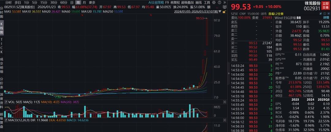 1月23日收盘,锋龙股份再度“10cm”涨停,收于99.53元/股,总市值217.48亿元。